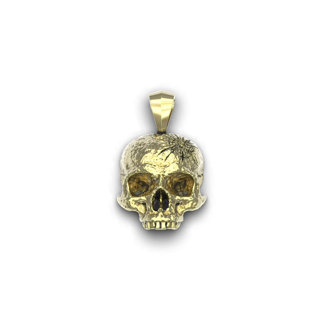 COLGANTE CALAVERA CON DISPARO INCRUSTADO ACABADO EN ORO 18K